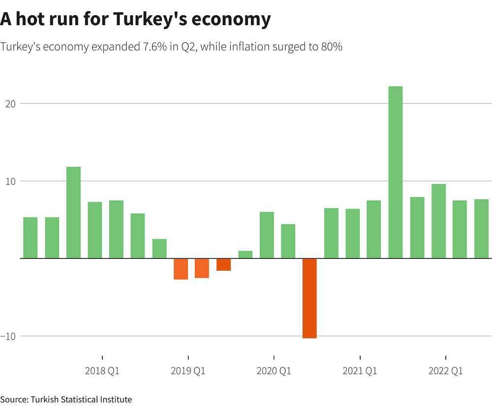 ISTANBUL (Reuters) – Turkey’s economy grew 7.6% year-on-year in the second quarter as expected, extending a hot streak on strong domestic demand and exports, according to data on Wednesday, though economic activity was seen slowing through year end as demand cools.